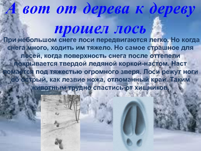 Но самое страшное для лосей, когда поверхность снега после оттепели покрывается твердой ледяной коркой-настом. Наст ломается под тяжестью огромного зверя. Лоси режут ноги об острый, как лезвие ножа, отломанный край. Таким животным трудно спастись от хищников.