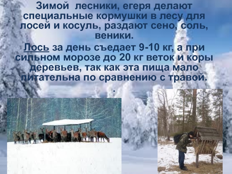 Слайд 25Зимой лесники, егеря делают специальные кормушки в лесу для лосей