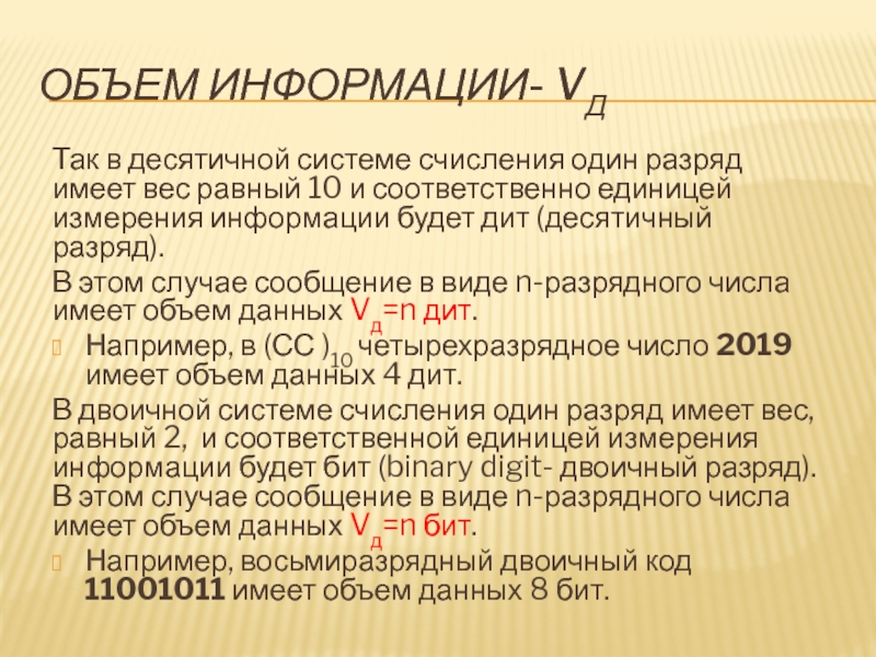 В этом случае сообщение в виде n-разрядного числа имеет объем данных Vд=n дит.