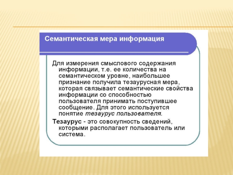 Среди известных подходов к семантической оценке информации наибольшее распространение получил тезаурусный подход, когда содержащийся в принятом сообщении смысл оценивается путем соотнесения с тезаурусом получателя(приемника), его способностью понимать и принимать поступившее сообщение.