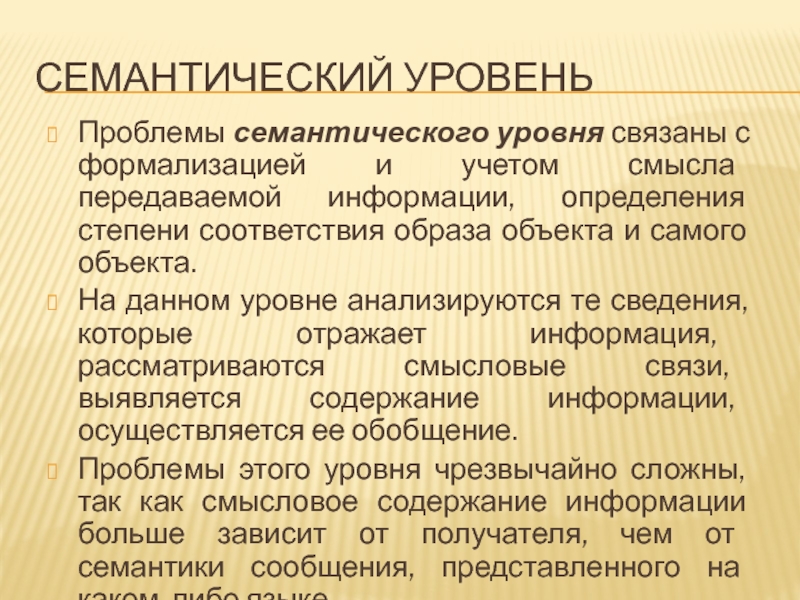 Проблемы семантического уровня связаны с формализацией и учетом смысла