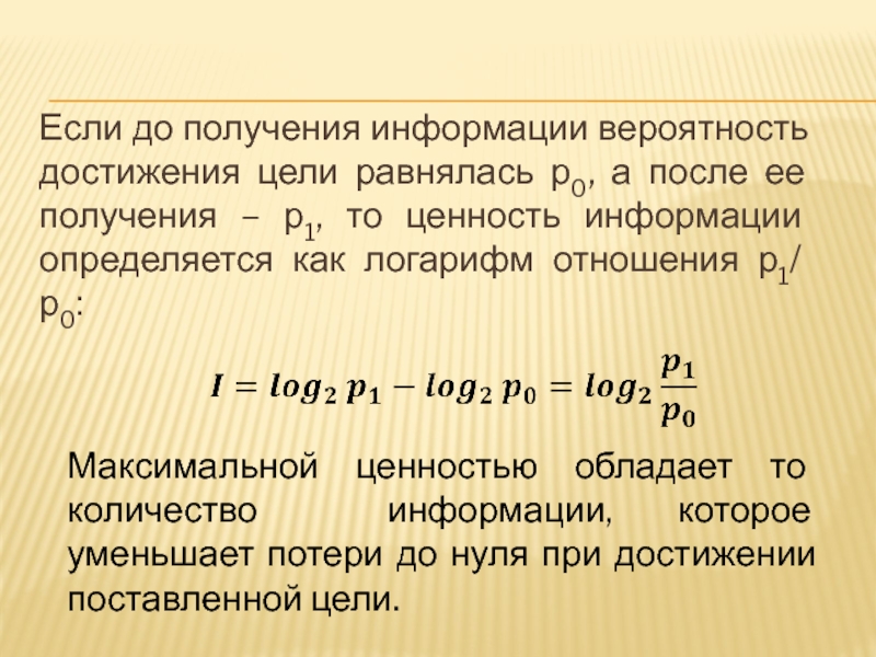 Слайд 35Если до получения информации вероятность достижения цели равнялась р0, а