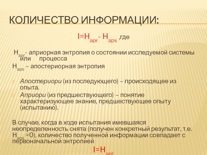 В случае, когда в ходе испытания имевшаяся неопределенность снята (получен конкретный результат, т.е. Haps =0), количество полученной информации совпадает с первоначальной энтропией