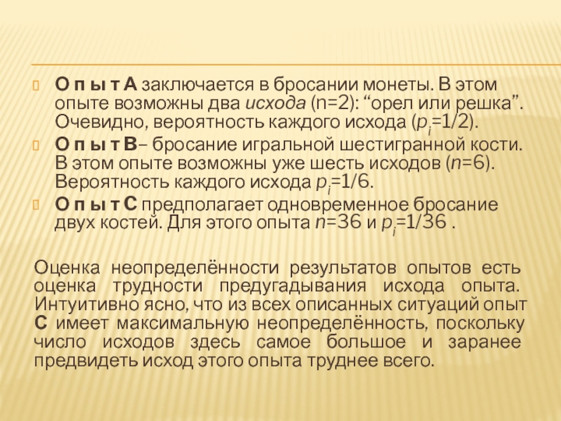 Оценка неопределённости результатов опытов есть оценка трудности предугадывания исхода опыта. Интуитивно ясно, что из всех описанных ситуаций опыт С имеет максимальную неопределённость, поскольку число исходов здесь самое большое и заранее предвидеть исход этого опыта труднее всего.