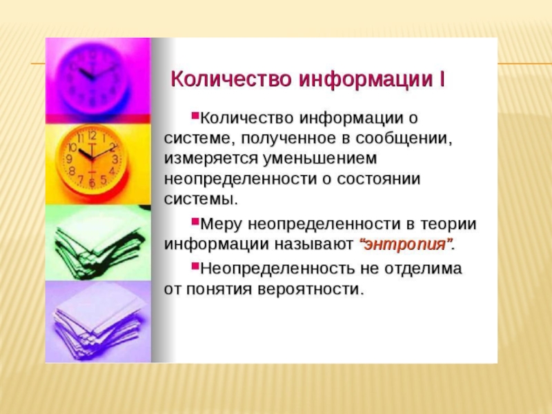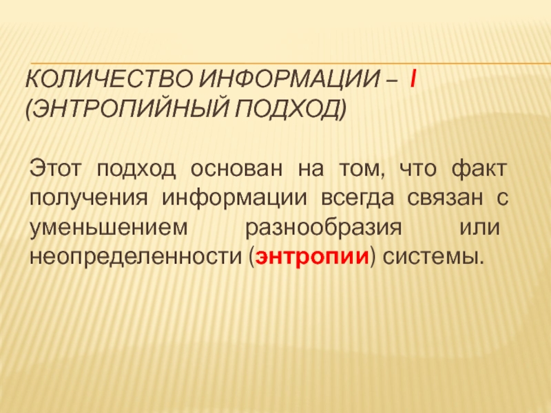 Слайд 18Таким образом, при энтропийном подходе под информацией понимается количественная величина