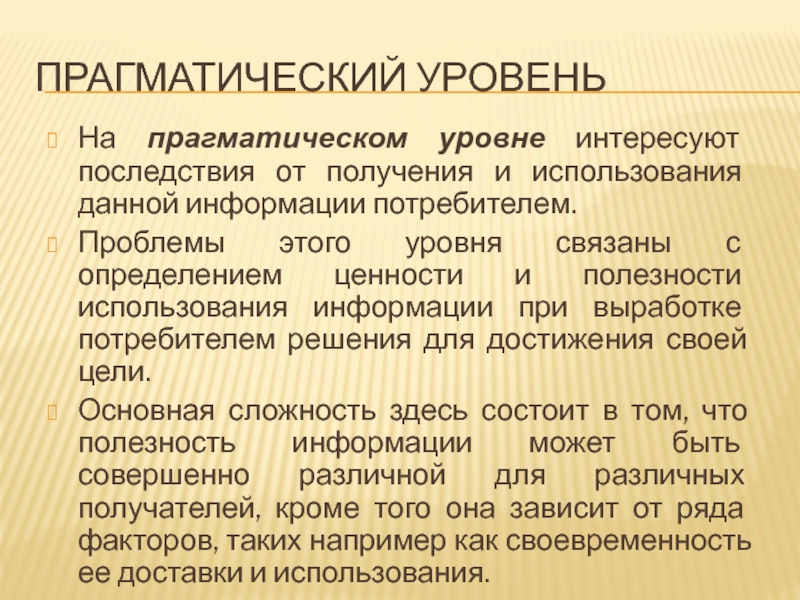 Проблемы этого уровня чрезвычайно сложны, так как смысловое содержание информации больше зависит от получателя, чем от семантики сообщения, представленного на каком-либо языке.