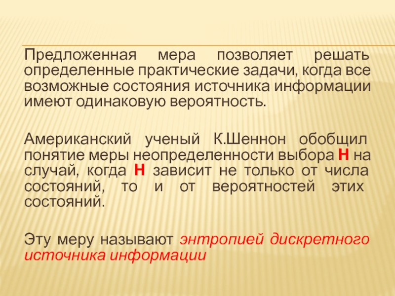 меры неопределенности выбора Н на случай, когда Н зависит не только от числа состояний, то и от вероятностей этих состояний.