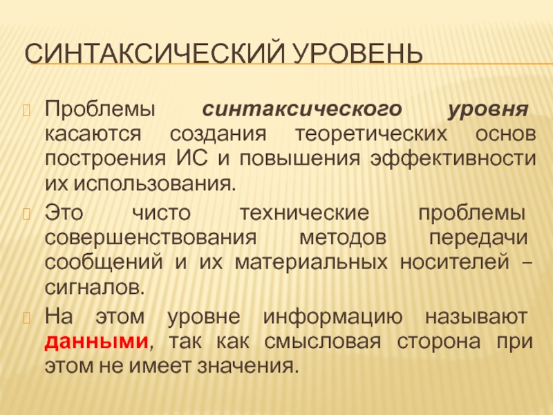 Проблемы синтаксического уровня касаются создания теоретических основ построения ИС