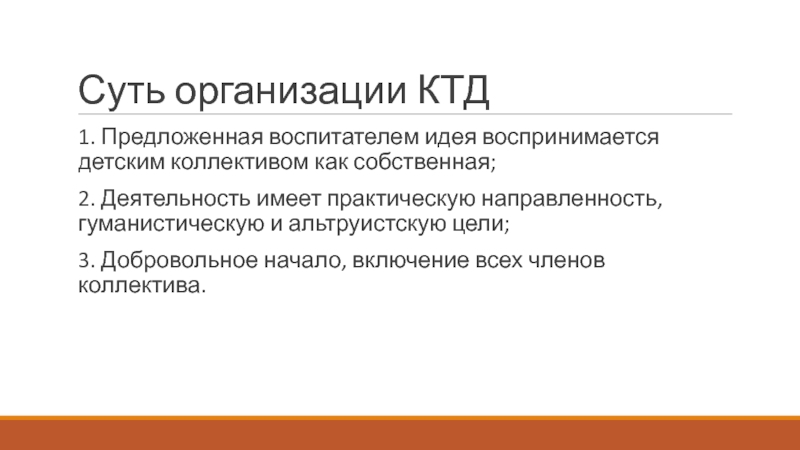 Суть организации КТД1. Предложенная воспитателем идея воспринимается детским коллективом как собственная;2. Деятельность имеет практическую направленность, гуманистическую и