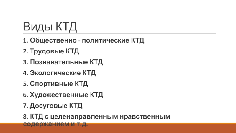 Виды КТД1. Общественно - политические КТД2. Трудовые КТД3. Познавательные КТД4. Экологические КТД5. Спортивные КТД6. Художественные КТД7. Досуговые