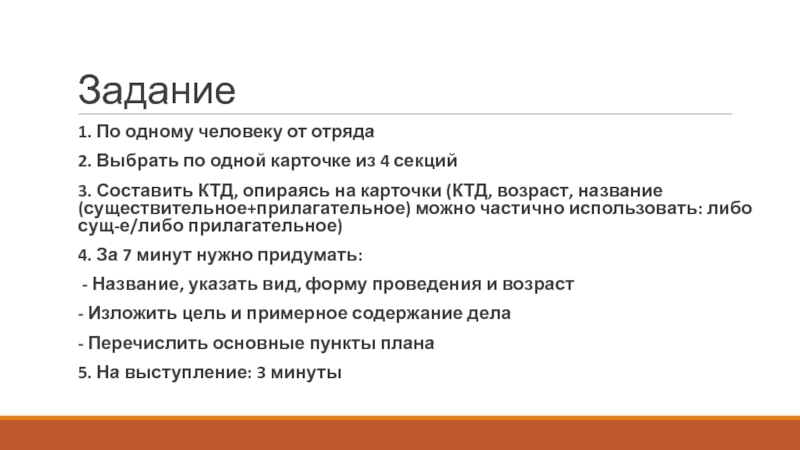 Задание1. По одному человеку от отряда2. Выбрать по одной карточке из 4 секций3. Составить КТД, опираясь на
