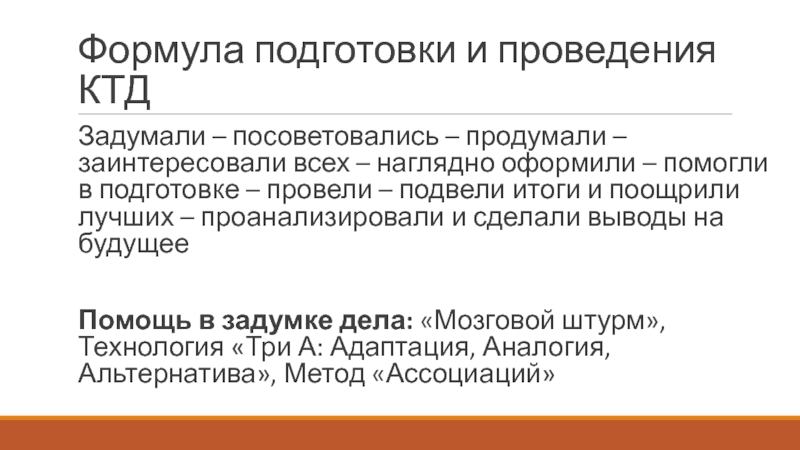 Формула подготовки и проведения КТДЗадумали – посоветовались – продумали – заинтересовали всех – наглядно оформили – помогли