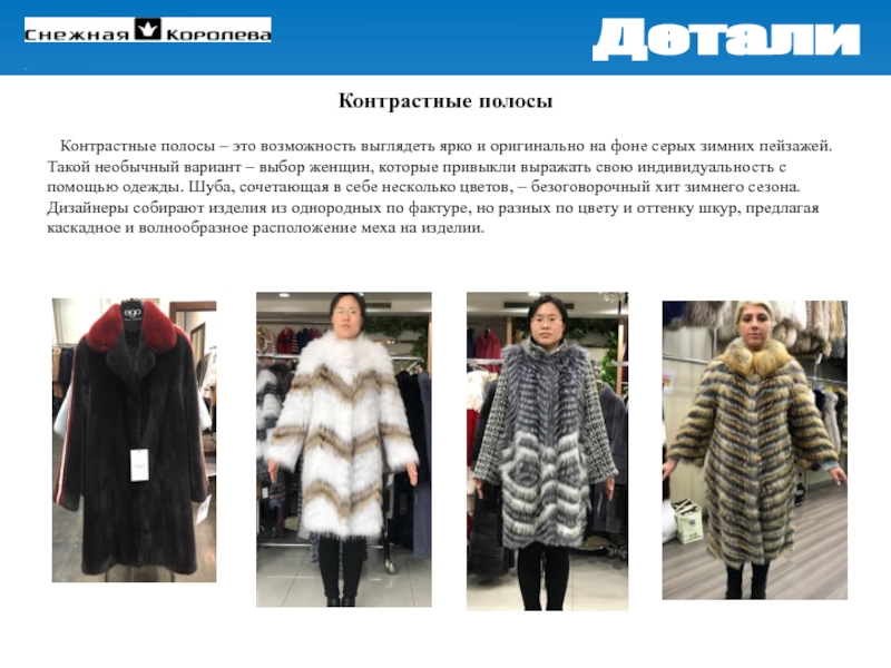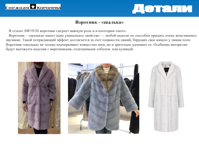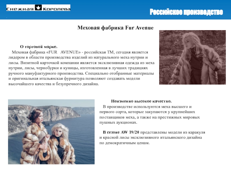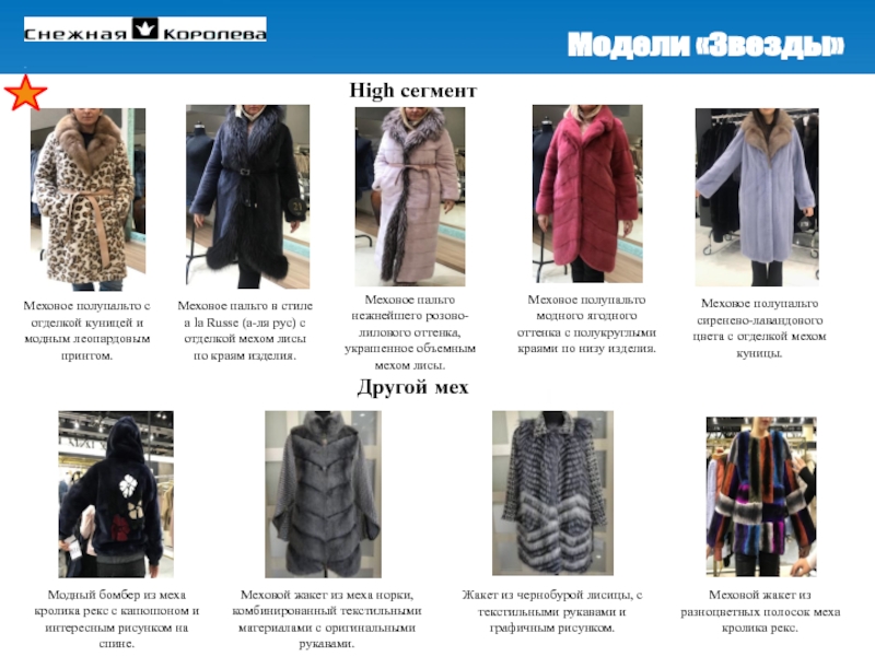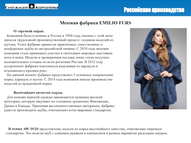 новым дизайном.PURPLE - Лучшие из лучших шкурки норки качества Purple характеризуются легкостью и шелковистостью, благодаря своей тонкой короткой ости и подпуши, которая является исключительно густой и полноволосой. Эксклюзивный мех, отобранный по жесточайшим критериям. Только 1% всех шкурок получает этот ярлык.