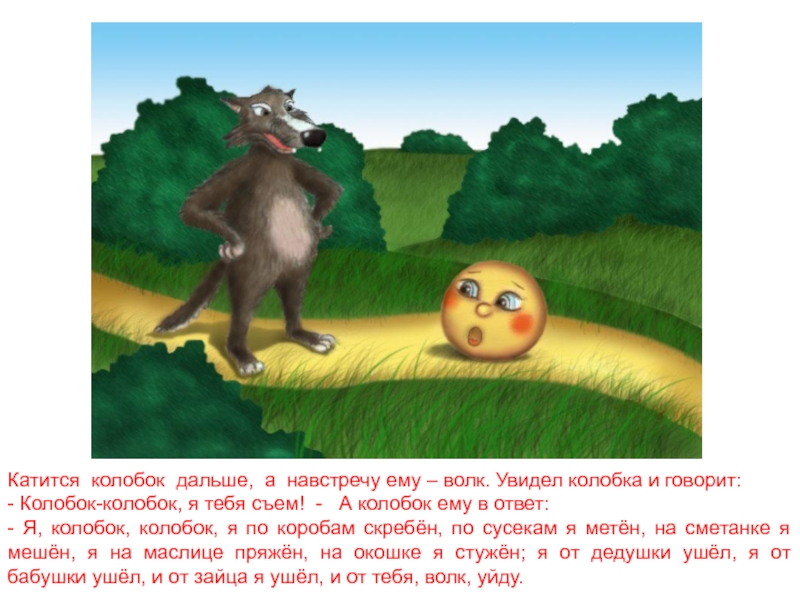 Слайд 5Катится колобок дальше, а навстречу ему – волк. Увидел колобка