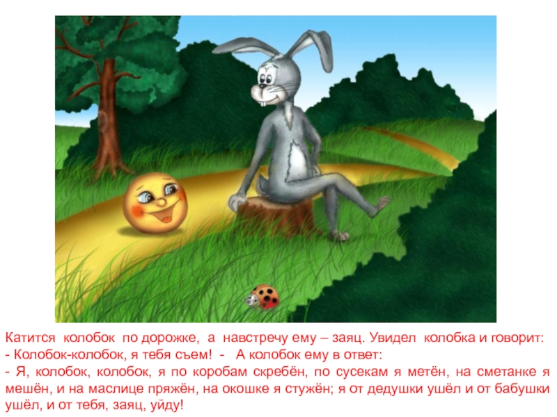 Слайд 4Катится колобок по дорожке, а навстречу ему – заяц. Увидел