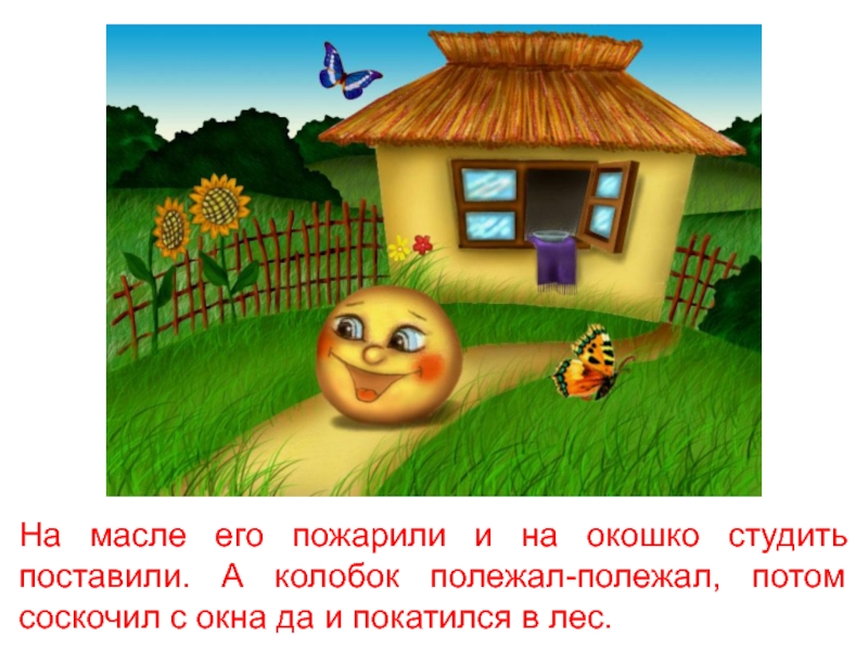 колобок полежал-полежал, потом соскочил с окна да и покатился в