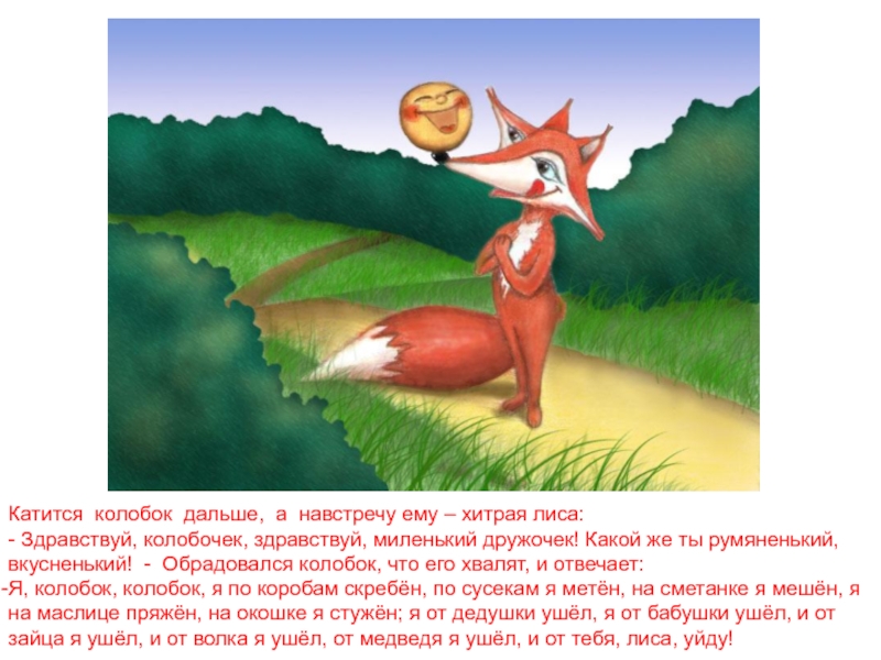 Слайд 7Катится колобок дальше, а навстречу ему – хитрая лиса: