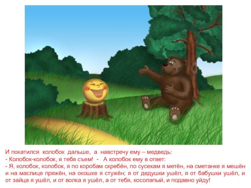 Слайд 6И покатился колобок дальше, а навстречу ему – медведь: