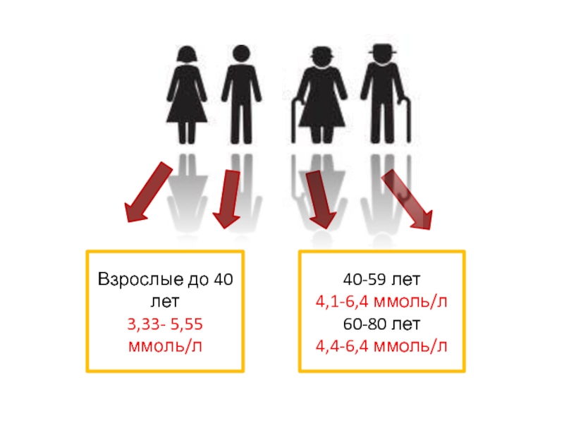 Слайд 5Взрослые до 40 лет 3,33- 5,55 ммоль/л