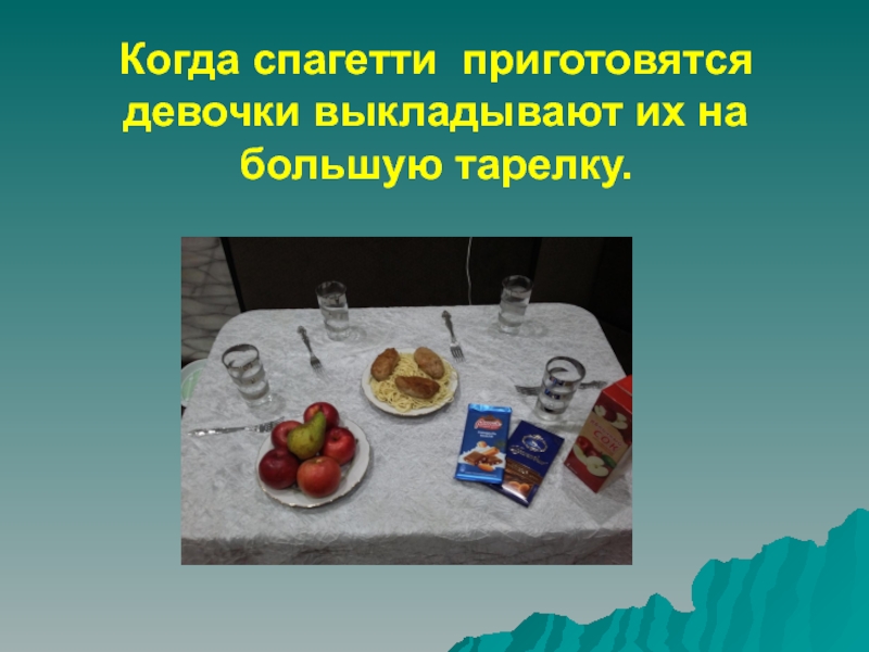 Слайд 6Когда спагетти приготовятся девочки выкладывают их на большую тарелку.