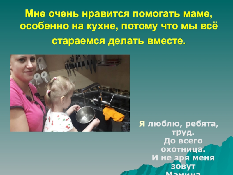 Слайд 5Мне очень нравится помогать маме, особенно на кухне, потому что