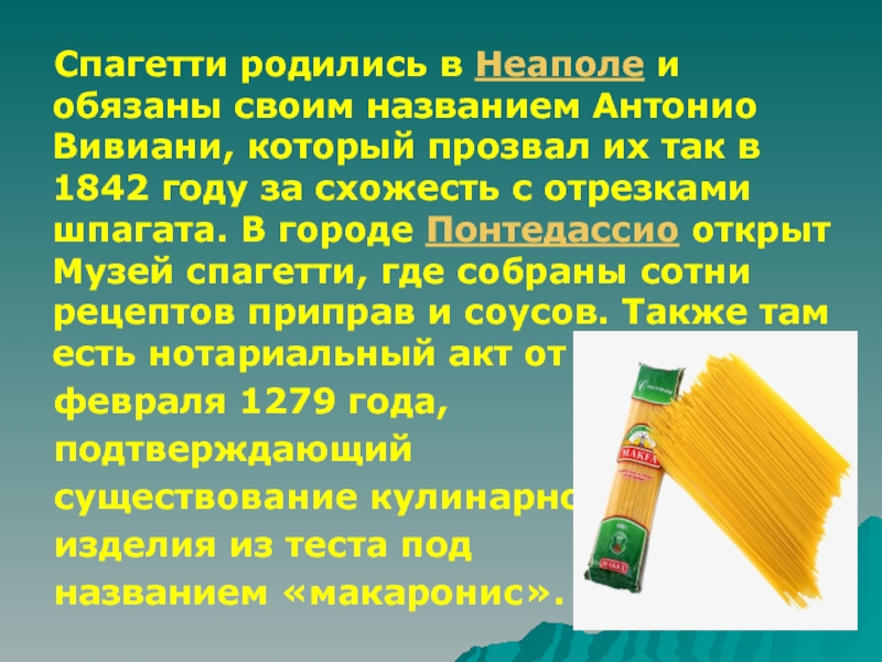 Слайд 3 Спагетти родились в Неаполе и обязаны своим названием Антонио Вивиани,