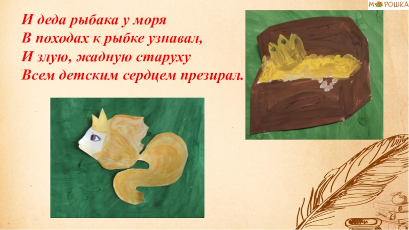И деда рыбака у моря В походах к рыбке узнавал, И злую, жадную старуху Всем детским сердцем