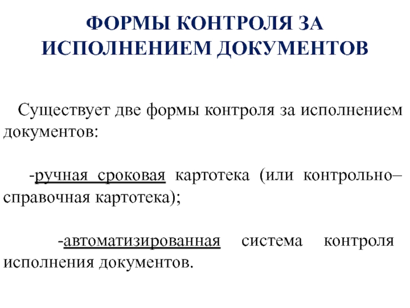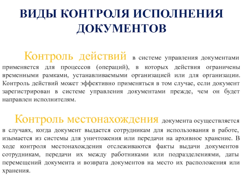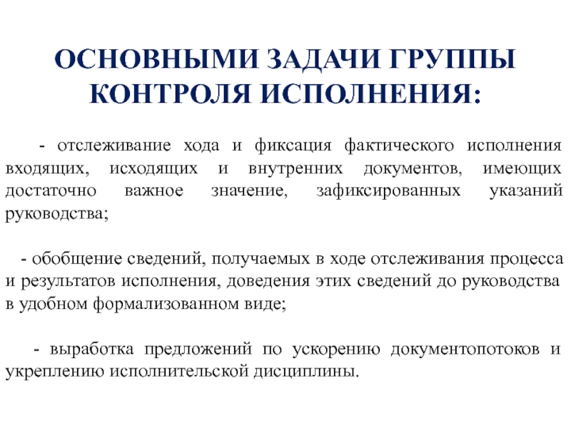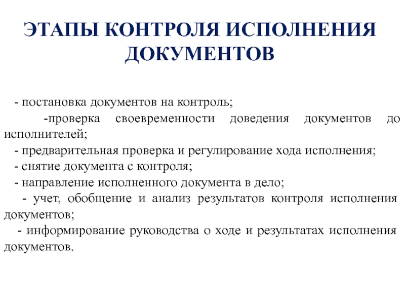 - проанализировать этапы постановки документов на контроль; ход проверки своевременности доведения документов до исполнителей; процесс снятия документа с контроля, направление исполненного документа в дело, учет, обобщение и анализ результатов контроля исполнения документов.