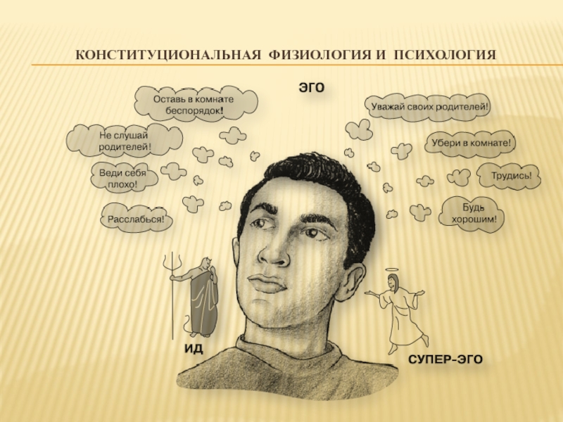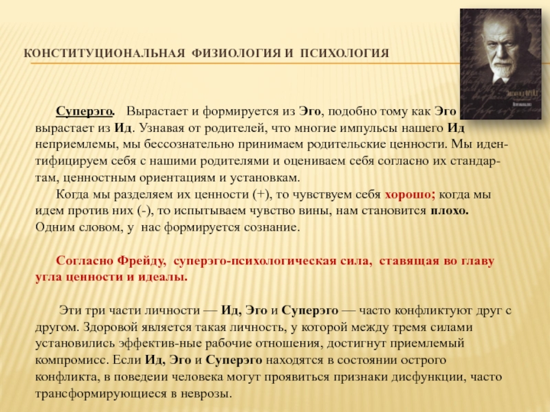 Эти три части личности — Ид, Эго и Суперэго — часто конфликтуют друг с другом. Здоровой является такая личность, у которой между тремя силами установились эффектив-ные рабочие отношения, достигнут приемлемый компромисс. Если Ид, Эго и Суперэго находятся в состоянии острого конфликта, в поведеии человека могут проявиться признаки дисфункции, часто трансформирующиеся в неврозы.