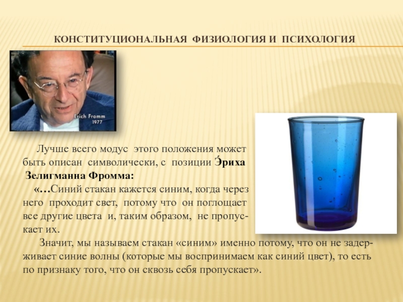 Значит, мы называем стакан «синим» именно потому, что он не задер-живает синие волны (которые мы воспринимаем как синий цвет), то есть по признаку того, что он сквозь себя пропускает».