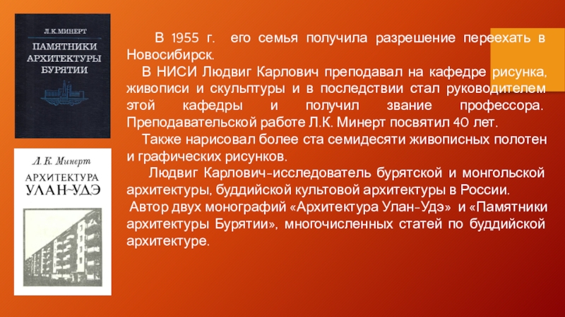 По разработанным им чертежам – индивидуальным либо в соавторстве с опытными архитекторами А.Р. Вампиловым и Д.Н. Меньшиковым, построены здания, без которых ныне трудно представить образ города.