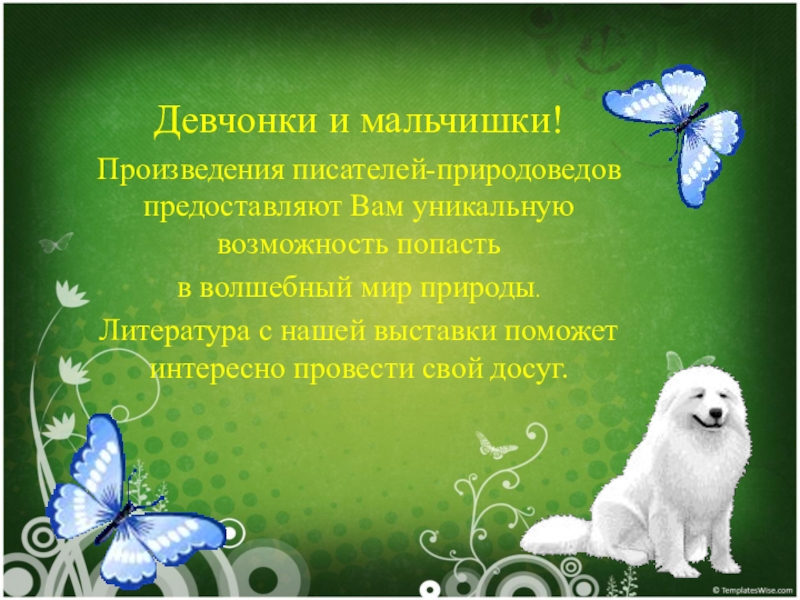 Девчонки и мальчишки!Произведения писателей-природоведов предоставляют Вам уникальную возможность попасть в волшебный мир природы.Литература с нашей выставки поможет