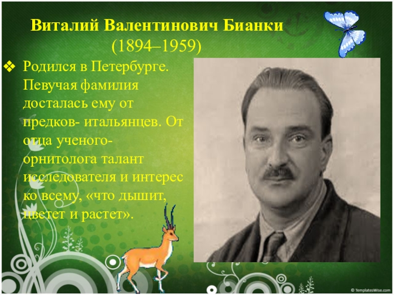 Виталий Валентинович Бианки (1894–1959)Родился в Петербурге. Певучая фамилия досталась ему от предков- итальянцев. От отца ученого- орнитолога