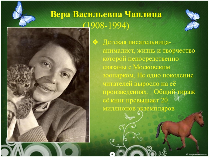 Вера Васильевна Чаплина (1908-1994) Детская писательница-анималист, жизнь и творчество которой непосредственно связаны с Московским зоопарком. Не