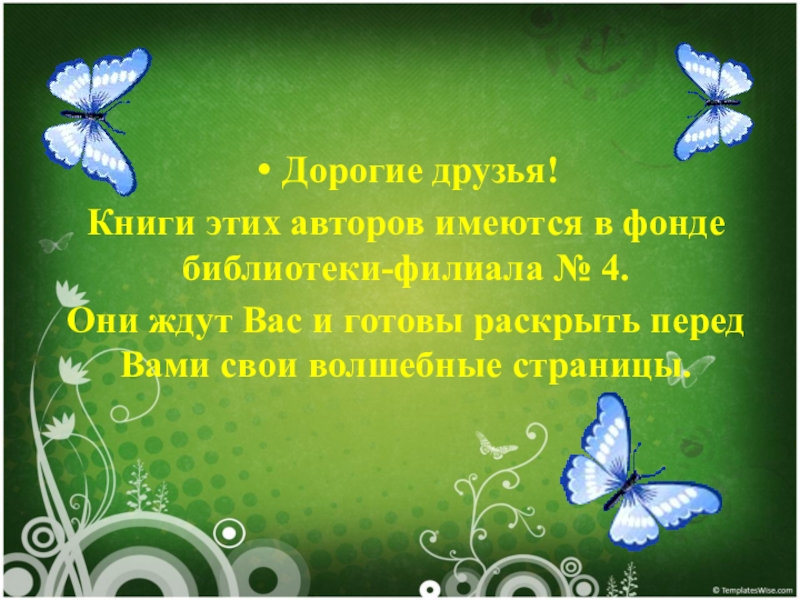 Дорогие друзья!Книги этих авторов имеются в фонде библиотеки-филиала № 4. Они ждут Вас и готовы