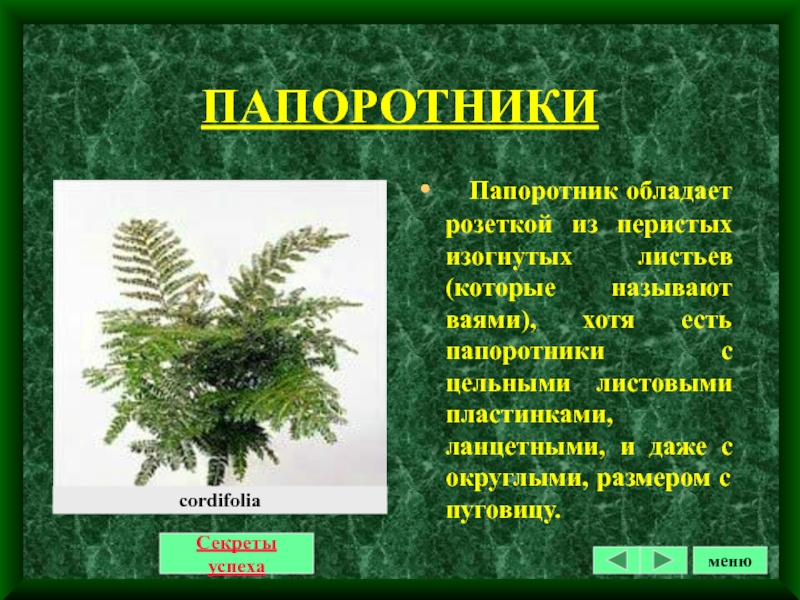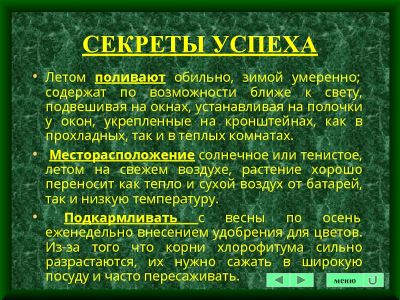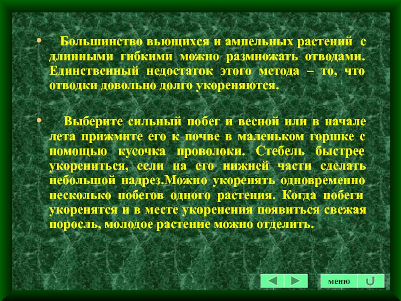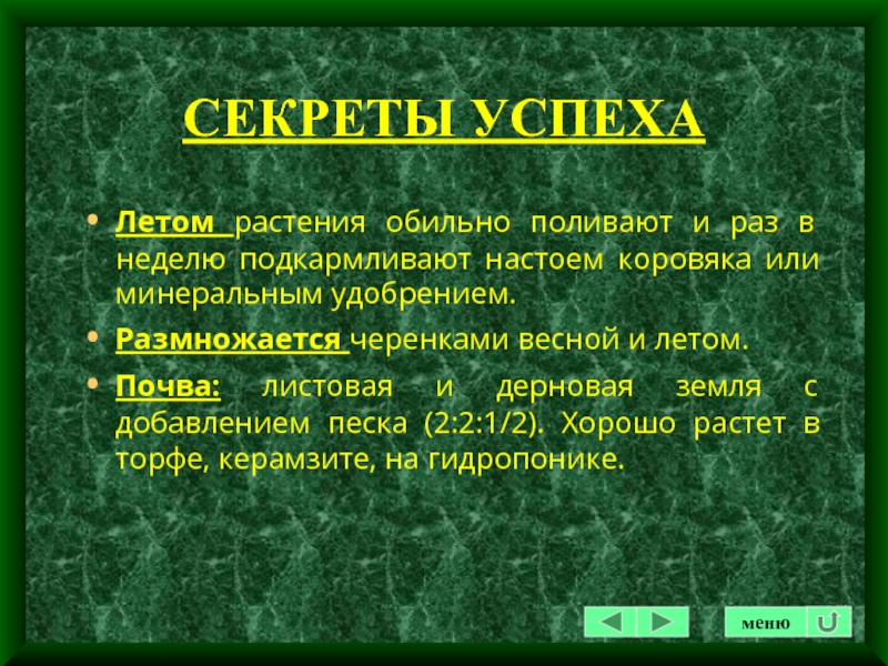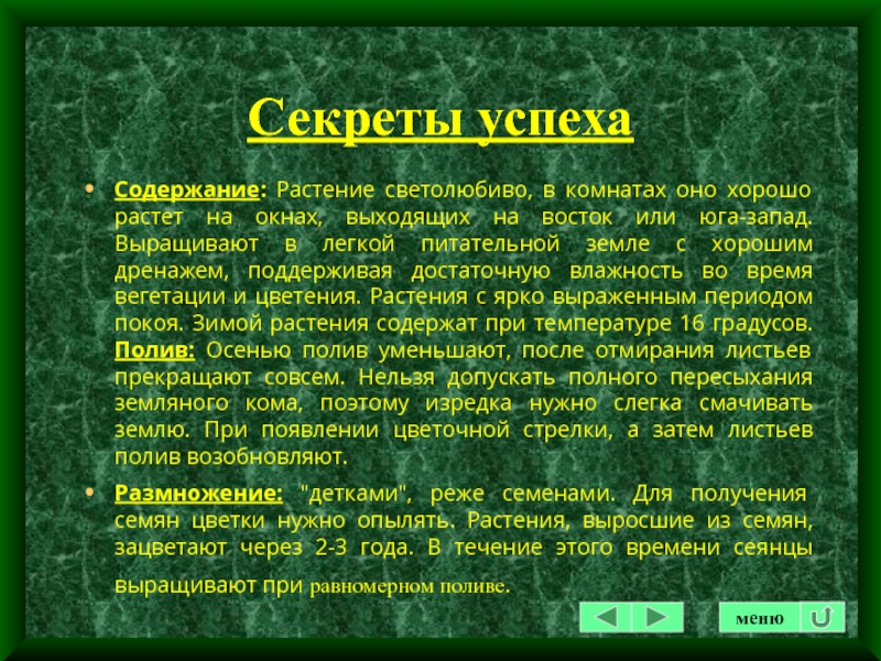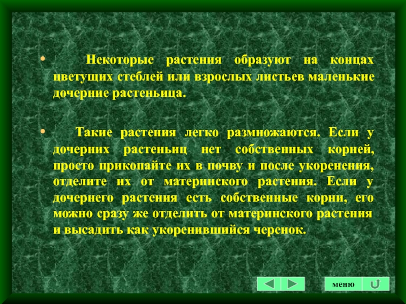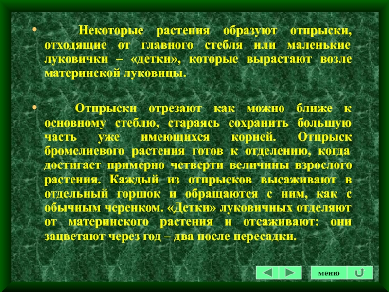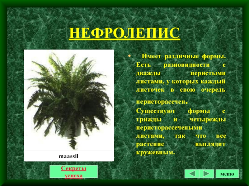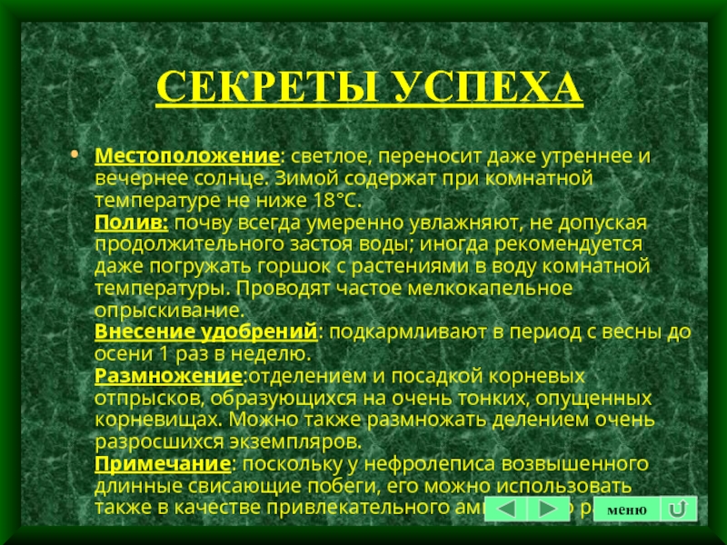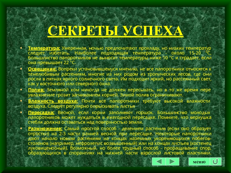 Размножение: Самый простой способ - делением растения (если оно образует отростки) на 2-3 части ранней весной при пересадке. Некоторые папоротники дают начало новым растениям на концах наземных укореняющихся побегов-столонов (например, нефролепис возвышенный) или на концах листьев (костенец луковиценосный). Возможный, но более трудный способ - проращивание спор, образующихся в спорангиях на нижней части взрослой листовой пластинки.