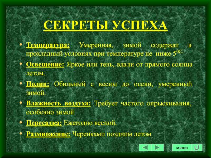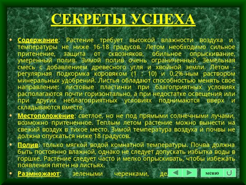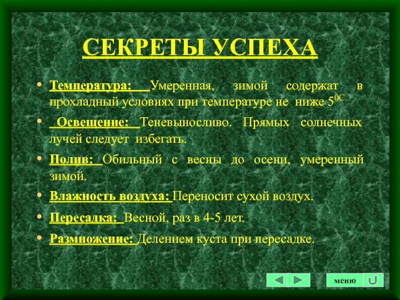 не выносит температуры ниже 10 °С и страдает, если она превышает 22 °С.