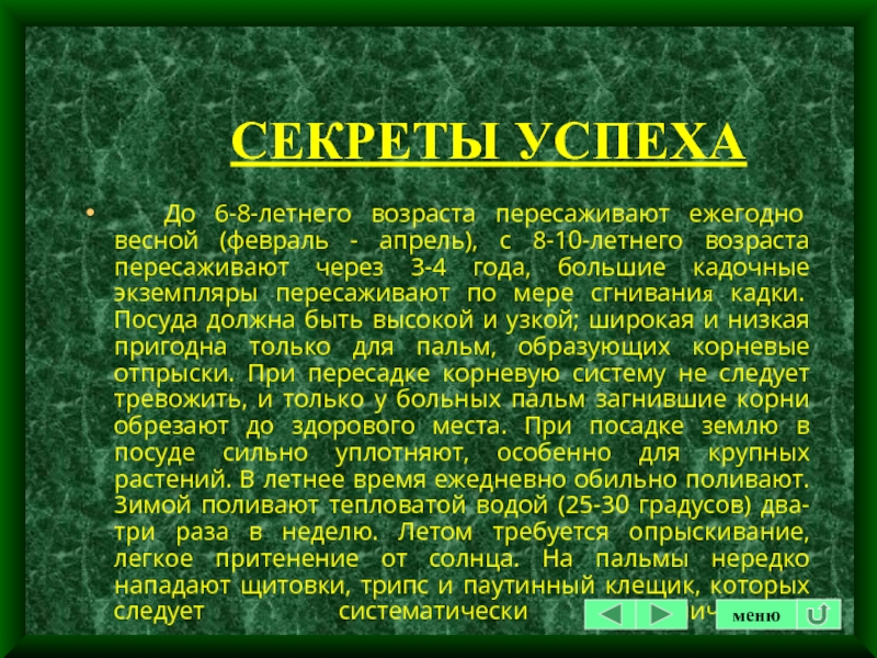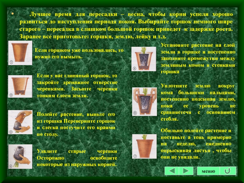 Пересадка: Весной, если корни заполняют горшок. Большинство молодых папоротников может нуждаться в ежегодной пересадке. Помните, что верхушка стебля должна оставаться над поверхностью земли.