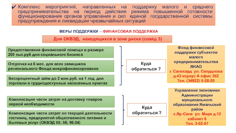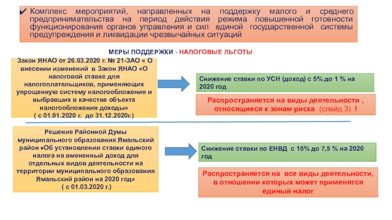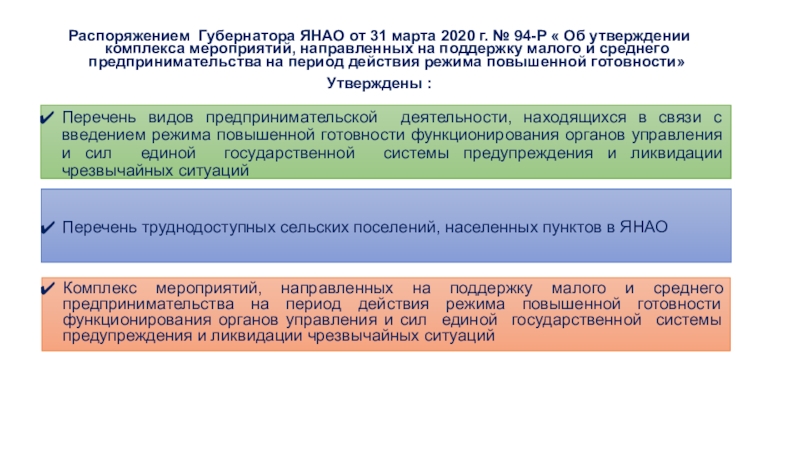 Распоряжением Губернатора ЯНАО от 31 марта 2020 г. № 94-Р « Об утверждении комплекса мероприятий, направленных на поддержку малого и среднего предпринимательства на период действия режима повышенной готовности»