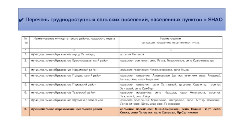 Перечень труднодоступных сельских поселений, населенных пунктов в ЯНАО