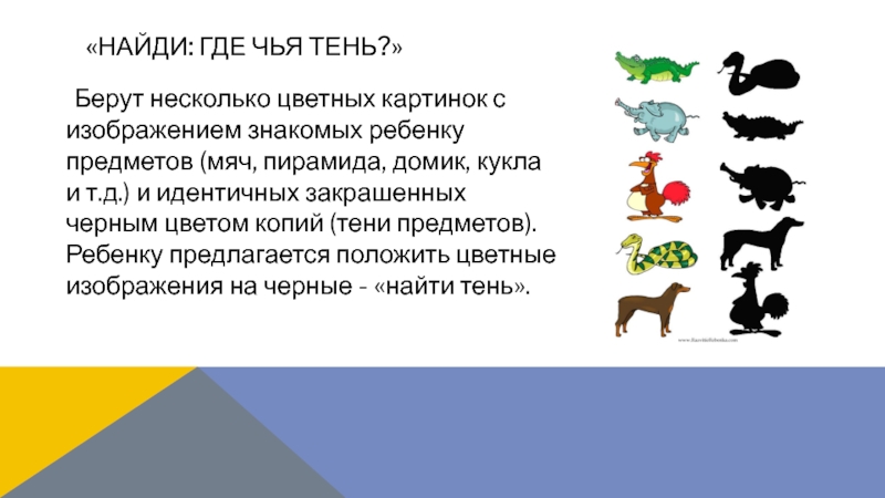 копий (тени предметов). Ребенку предлагается положить цветные изображения на черные - «найти тень».