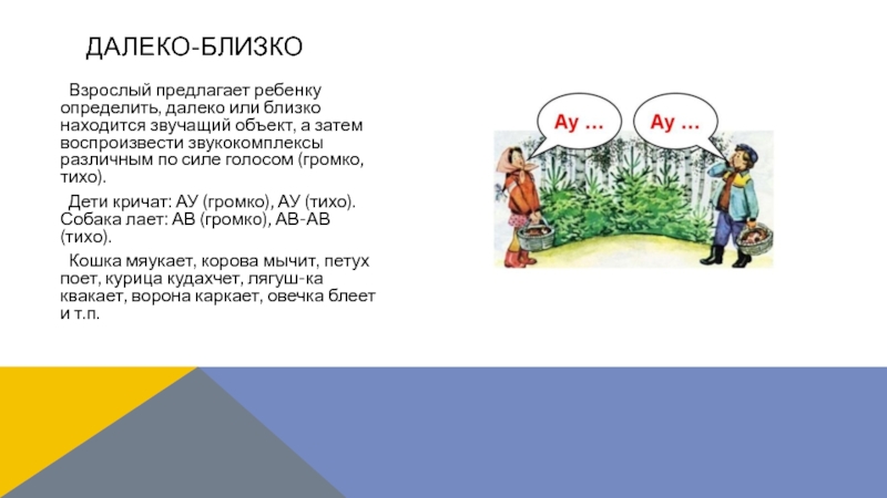 источника звучания. Ребенок различает голоса людей, звукоподражания животных, показывает на картинке предмет.