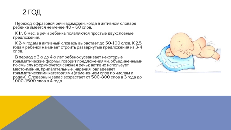 К 2-м годам а активный словарь вырастает до 50-100 слов. К 2,5 годам ребенок начинает строить развернутые предложения из 3-4 слов.