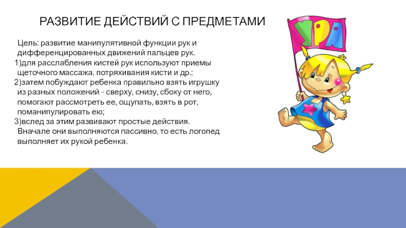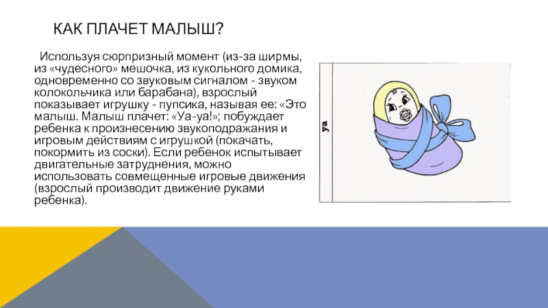 взрослый показывает игрушку - пупсика, называя ее: «Это малыш. Малыш плачет: «Уа-уа!»; побуждает ребенка к произнесению звукоподражания и игровым действиям с игрушкой (покачать, покормить из соски). Если ребенок испытывает двигательные затруднения, можно использовать совмещенные игровые движения (взрослый производит движение руками ребенка).