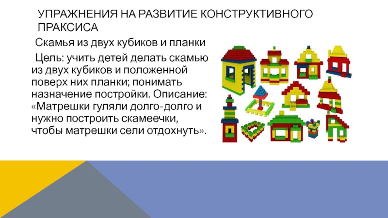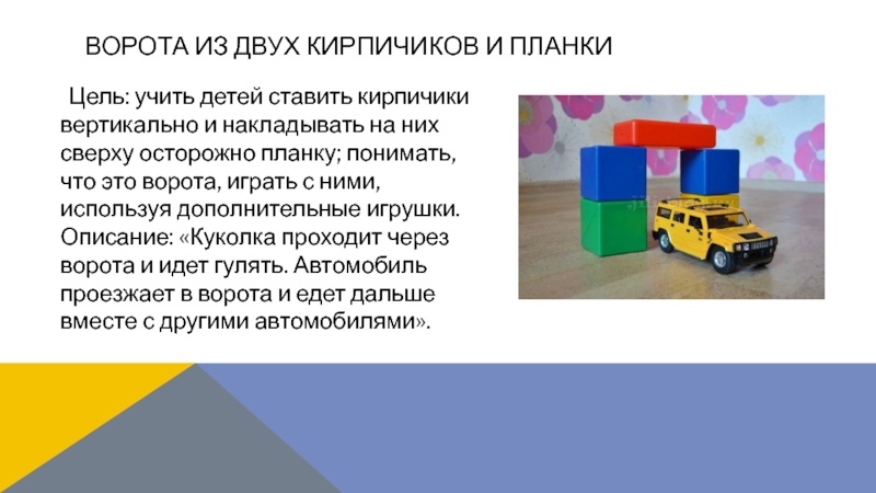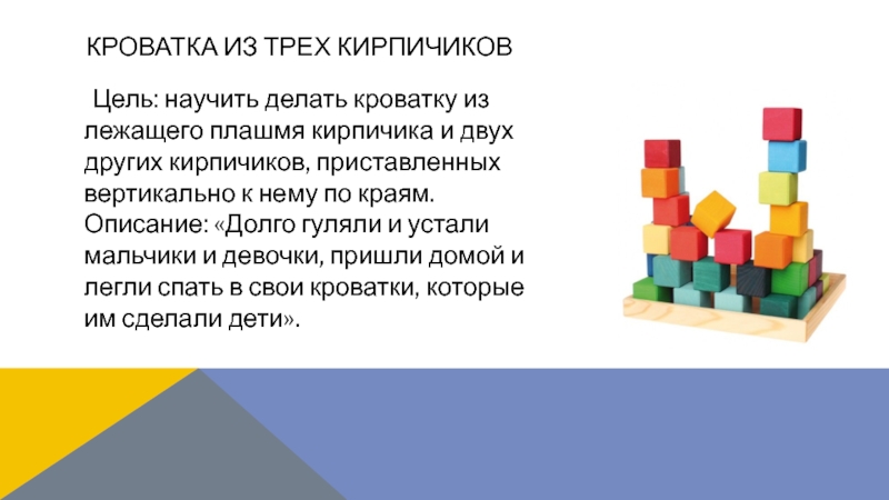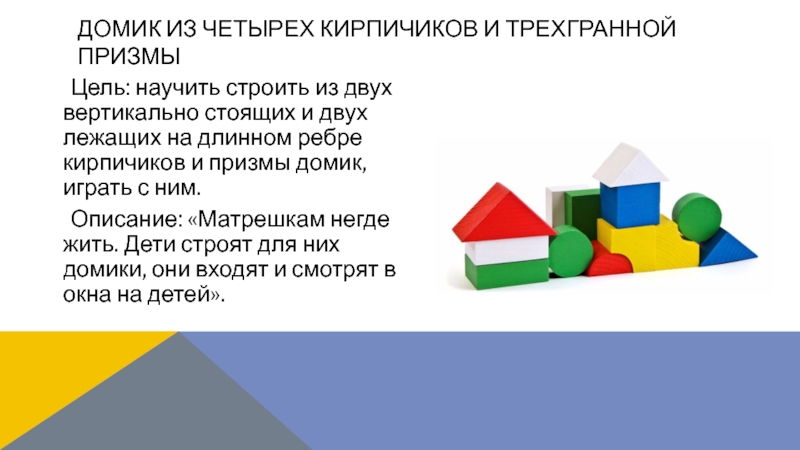 на длинном ребре кирпичиков и призмы домик, играть с ним.