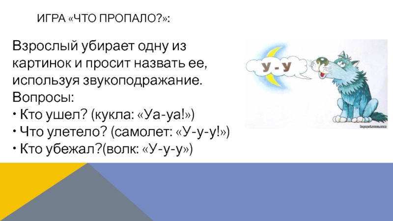 волк), используя звукоподражание, называет их («у-у», «а-а», «ау-ау»). Затем последовательно