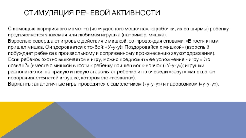 совершают игровые действия с мишкой, со-провождая словами: «В гости к нам пришел мишка. Он здоровается с то-бой: «У-у-у!» Поздоровайся с мишкой» (взрослый побуждает ребенка к произвольному и сопряженному произнесению звукоподражания).