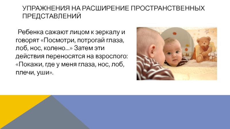 вместе будут искать. Обходит комнату, обсуждая все, что видит: «Вот стол, за которым мы рисуем. Вот полка, здесь можно спрятать нашу игрушку». Потом ребенка отвлекают игрой. Через некоторое время предлагают поискать игрушку. Когда игрушка найдена, фиксируется результат: «Игрушка была на полке». Обходя комнату, взрослый называет направление, в котором двигается: «Вот окно. Пойду от окна к двери. Здесь шкаф. Посмотрю наверх - наверху нет. Посмотрю вниз - внизу нет» и т.д.