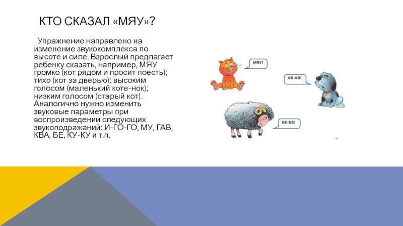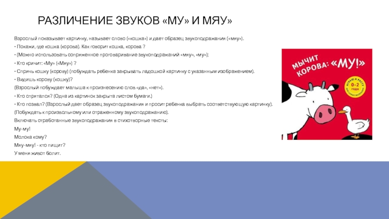 • (Можно использовать сопряженное проговаривание звукоподражаний «мяу», «му»);