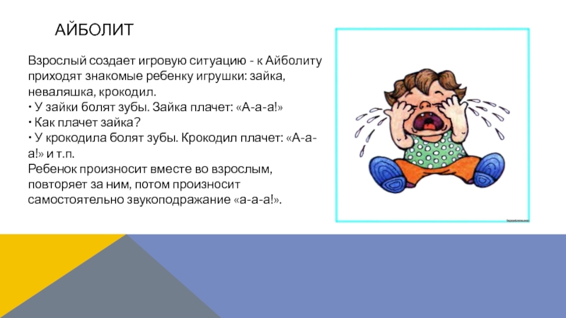 • У крокодила болят зубы. Крокодил плачет: «А-а-а!» и т.п.